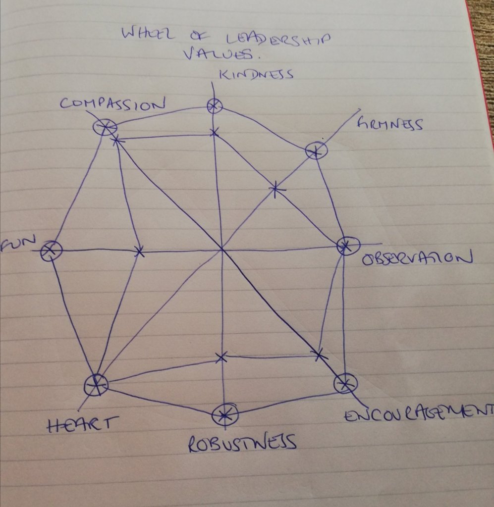 Secondly, I identified a bunch of personal values I admire in other leaders and regular people I work with or am friends with… These include kindness, firmness (or confidence in themselves, though not arrogance), observation skills, encouragement of others, robustness of thought, heart (gentleness and courage), a sense of fun and compassion. The chart below is how I view myself and, again, how I would like to be: